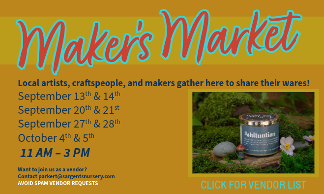 Please Note: if you’ve purchased a ticket for an event and you’re unable to attend, please contact us at sargents@sargentsnursery.com and we will issue you a refund in the form of a Sargent’s gift card.