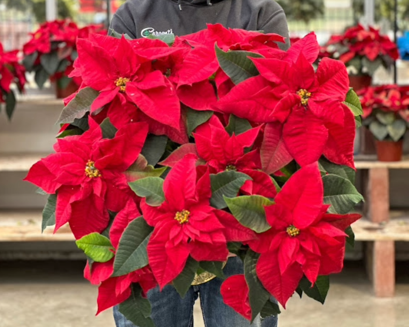 Our greenhouse is bursting with beautiful poinsettias in a variety of sizes — perfect for gifting, decorating, or adding a pop of festive color indoors.